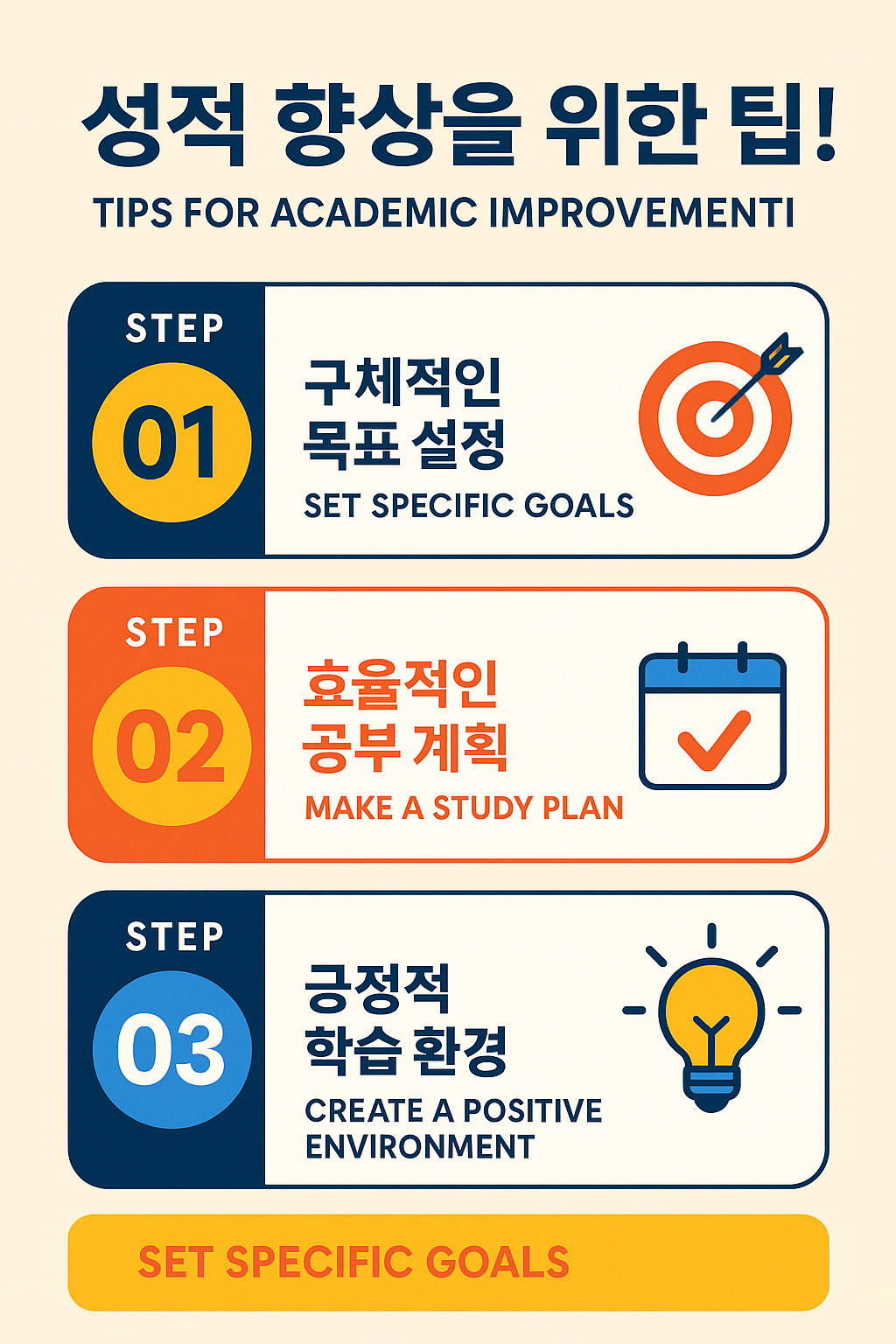 | 환경 조성 | 조용하고 정리된 공간 | 몰입도 & 성적 향상 |