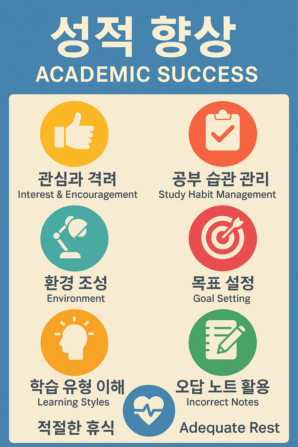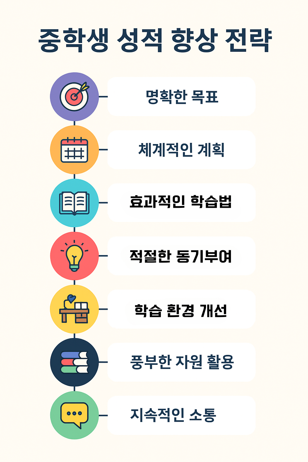중학생 성적 향상을 위해 부모는 공부하라는 말보다 전략과 계획을 함께 세워주는 역할이 중요합니다. 오늘부터 실천 가능한 방법으로 우리 아이의 성적 향상을 응원해 주세요!